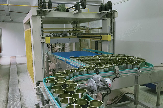空罐卸垛機(jī)——磁力洗罐機(jī)——鼓泡清洗機(jī)——預(yù)煮機(jī)——流槽冷卻機(jī)——量杯灌裝機(jī)——淋湯機(jī)——封罐機(jī)——裝卸籠機(jī)——滾杠巴氏殺菌機(jī)——風(fēng)刀——臥式貼標(biāo)機(jī)——開(kāi)箱機(jī)——裝箱機(jī)——封箱機(jī)——紙箱碼垛機(jī)