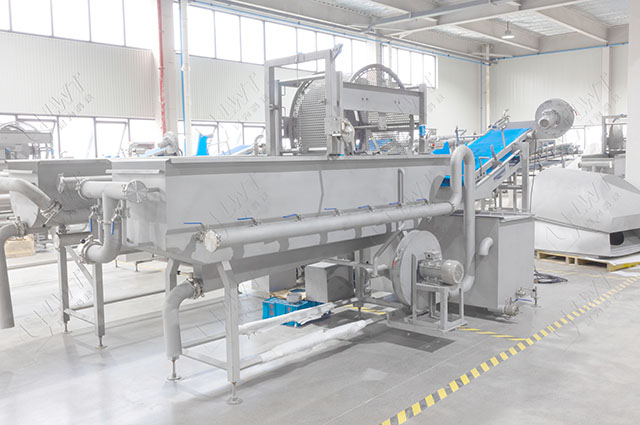 蔬菜通過提升設(shè)備送入清洗區(qū),初步去除泥土和雜質(zhì)。